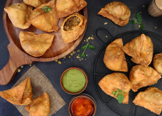 Crispy, savoury pastry filled with spiced potato and peas, served with mint and tamarind chutney.