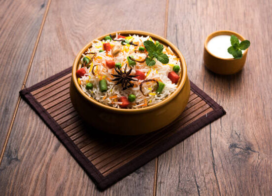 Layered, slow-cooked rice dish with mixed vegetables, whole spices, and fresh herbs, served with Raita.