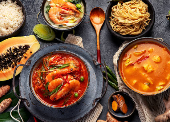Famous Thai sour and spicy clear soup flavoured with lemongrass, galangal, and kaffir lime leaves.